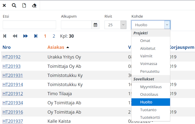 Mikäli Projekti-sovellus on käytössä, näkyy kohteen Projekti alla Omat-, Aloitetut-, Valmiit-, Voimassa- ja Peruutettu-valinnat.