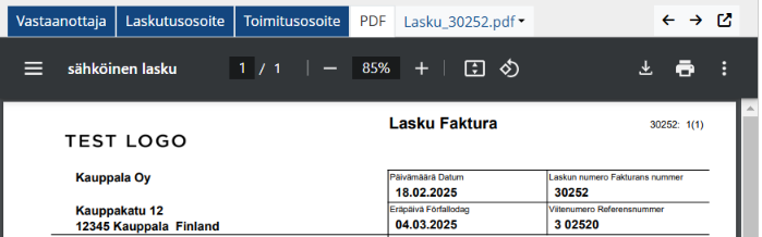 PDF-välilehdellä näytetään kuvana laskun tiedot joko verkkolaskusta, liitetystä PDF-dokumentista, kuvasta tai tulostetusta PDF-pohjasta samalla tavalla kuin Luontitapa-linkin takaakin.