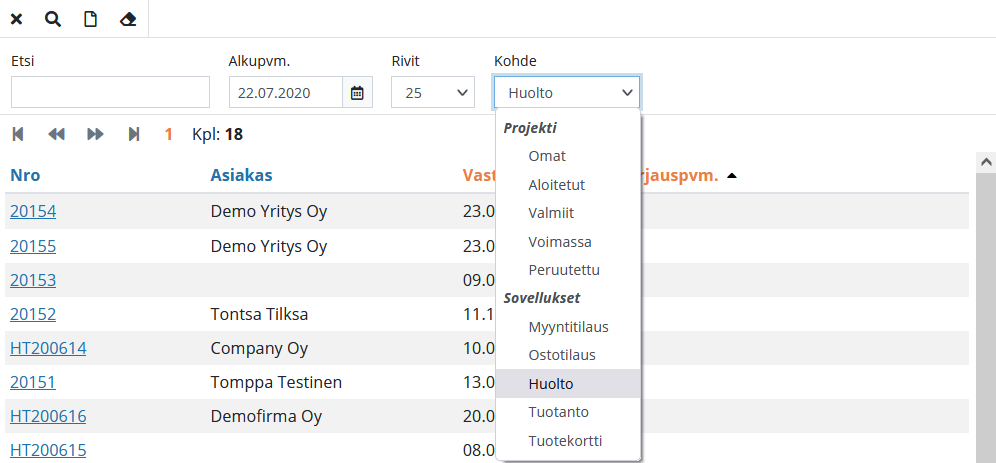 Mikäli Projekti-sovellus on käytössä, näkyy kohteen Projekti alla Omat-, Aloitetut-, Valmiit-, Voimassa- ja Peruutettu-valinnat.