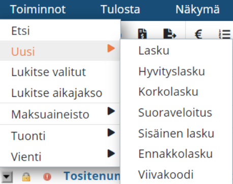 Laskutyyppi | Valinta on tarkoitettu semanttisten tietojen välittämiseen eri järjestelmien välillä (EU-koodisto UNTDID1001 -standardi). Laskutyyppi voidaan valita kentän valintalistalta. |