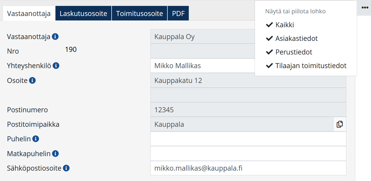 Vastaavalla tavalla voidaan valita mitä kenttiä näytetään Perustiedot ja Vastaanottajan tiedot lohkossa.
