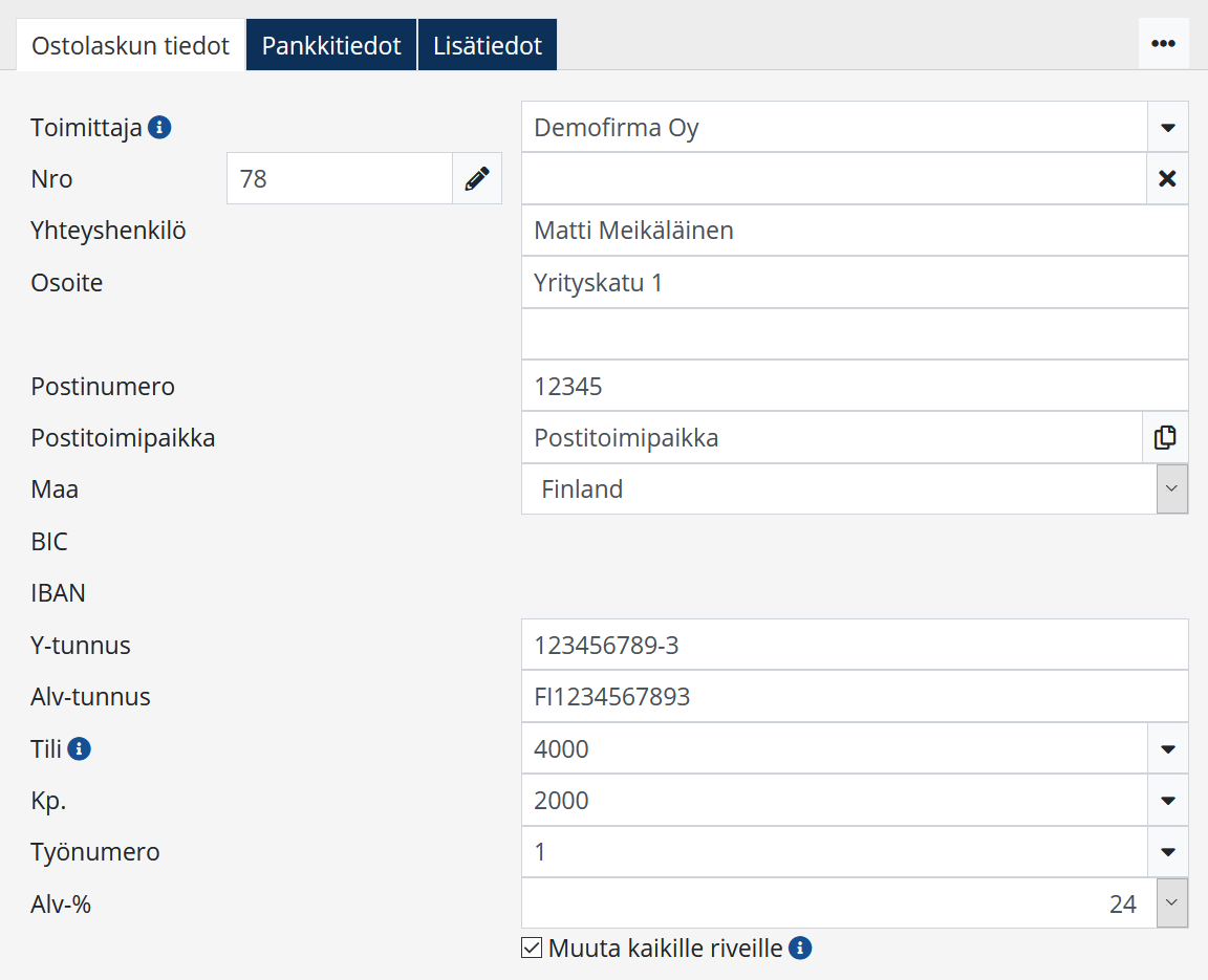 Pankkitiedot-välilehdellä on toimittajan pankkitiedot.
