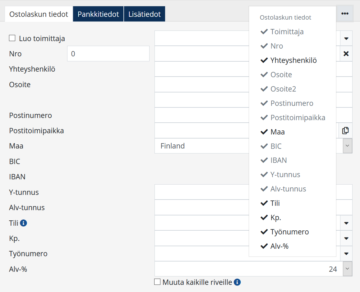 Osa kentistä on pakollisia ja niitä ei ole mahdollista piilottaa, piilotettavia kenttiä ovat Yhteyshenkilö, Maa, Tili, Kp, Työnumero ja Alv-% kentät.