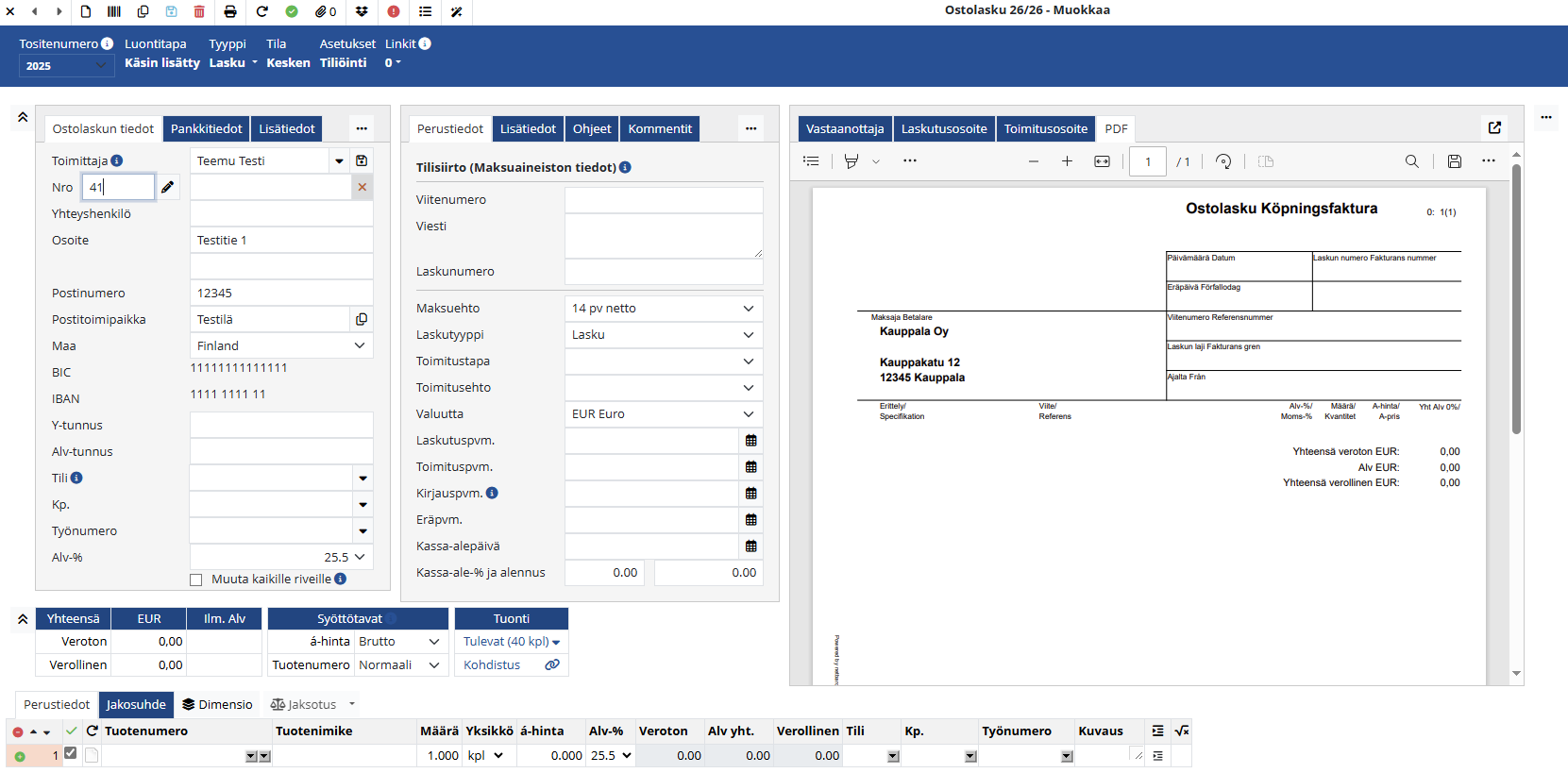 Toimittajan pankkitiedot ja Maa-asetus tallentuvat laskukohtaisesti.