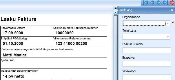 Laskun indeksoiminen aloitetaan napsauttamalla ylävalikon Indexing -painiketta. Indeksoinnilla järjestelmään syötetään laskusta tarvittavat tiedot.